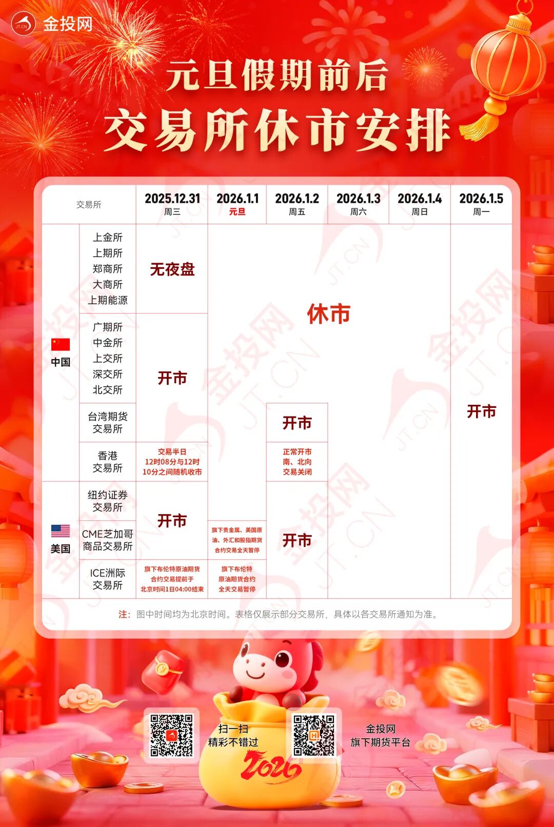 2026年1月1日(周四)-1月3日(周六)为元旦假期,国内期货市场、上金所及沪深北交易所休市,2025年12月31日(周三)晚无夜盘2026年1月5日(周一)起正常开市。假期前后,交易所会对部分品种的交易保证金比例及涨跌停板幅度做调整,敬请留意。